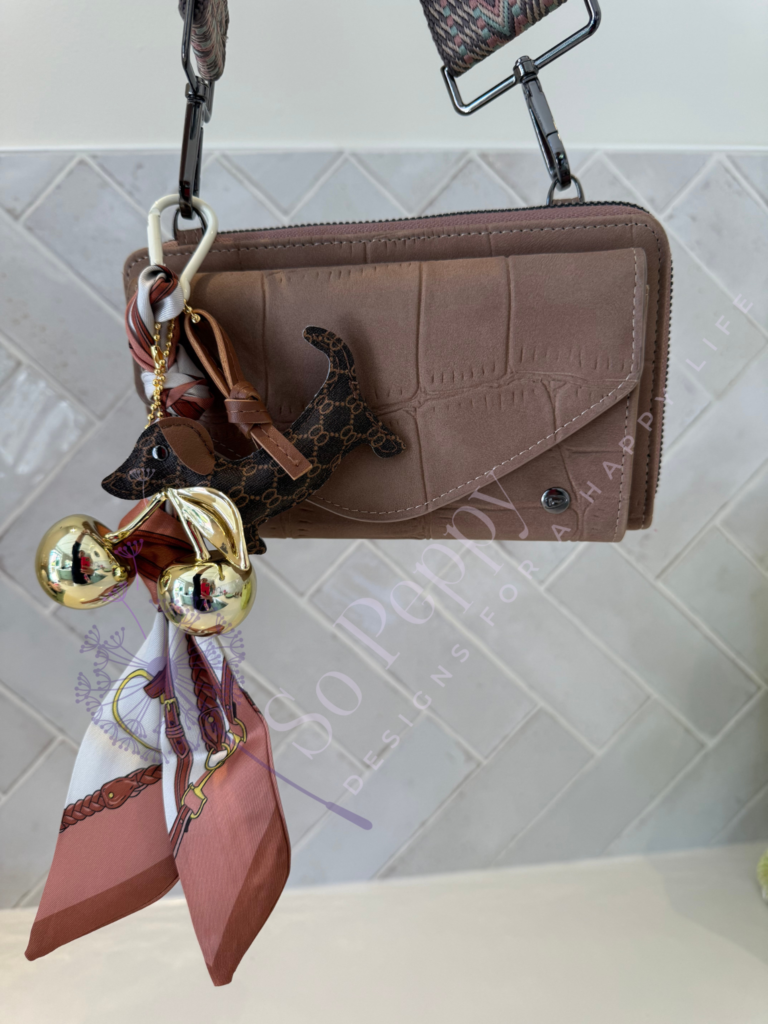 Voor de teckel liefhebber is deze luxe So Peppy Tekkel Charm een must-have! Met een schattig teckel ontwerp en stijlvolle gouden cherries voegt dit accessoire een decoratieve en speelse touch toe aan jouw tas of sleutelbos. De kleursamenstelling van bruin en goud geeft het geheel een luxe uitstraling die perfect te combineren is met elke outfit.